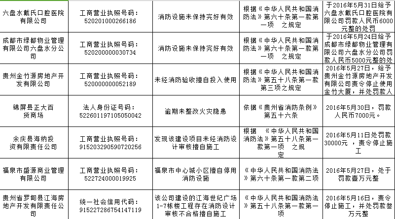 存在消防安全不良行为的16家单位分别为:安顺威斯汀大酒店有限公司;贵州深宏业物业服务有限公司;贵阳嗨捞餐饮有限公司;贵阳云岩金坡网络信息服务部;贵阳锦江物业管理有限公司;贵州天翔鹏运二手车交易市场有限公司;贵州赛易斯健身中心;贵州盛华园房地产开发有限公司;息烽新华医院;六盘水戴氏口腔医院有限公司;成都市绿都物业管理有限公司六盘水分公司;贵州金竹源房地产开发有限公司;锦屏县正大百货商场;余庆县海纳投资有限责任公司;福泉市盛源商业管理有限公司;贵州省罗甸县江海房地产开发有限责任公司。