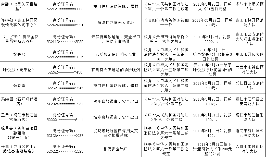 10名消防安全不良行为个人分别是:余静(七星关区百结堂);许婷勋(贵阳经开区爱情故事休闲中心);罗玲(贵阳金阳星百客商务酒店);冯继国 (石阡现代酒店);王勇(铜仁市碧江区桃源酒店);徐景春(务川自治县碧丽煌都娱乐会所);张慧(钟山区钟山西路炫客族服装店);叶俊彤(无单位);黎先启 ;张春华。
