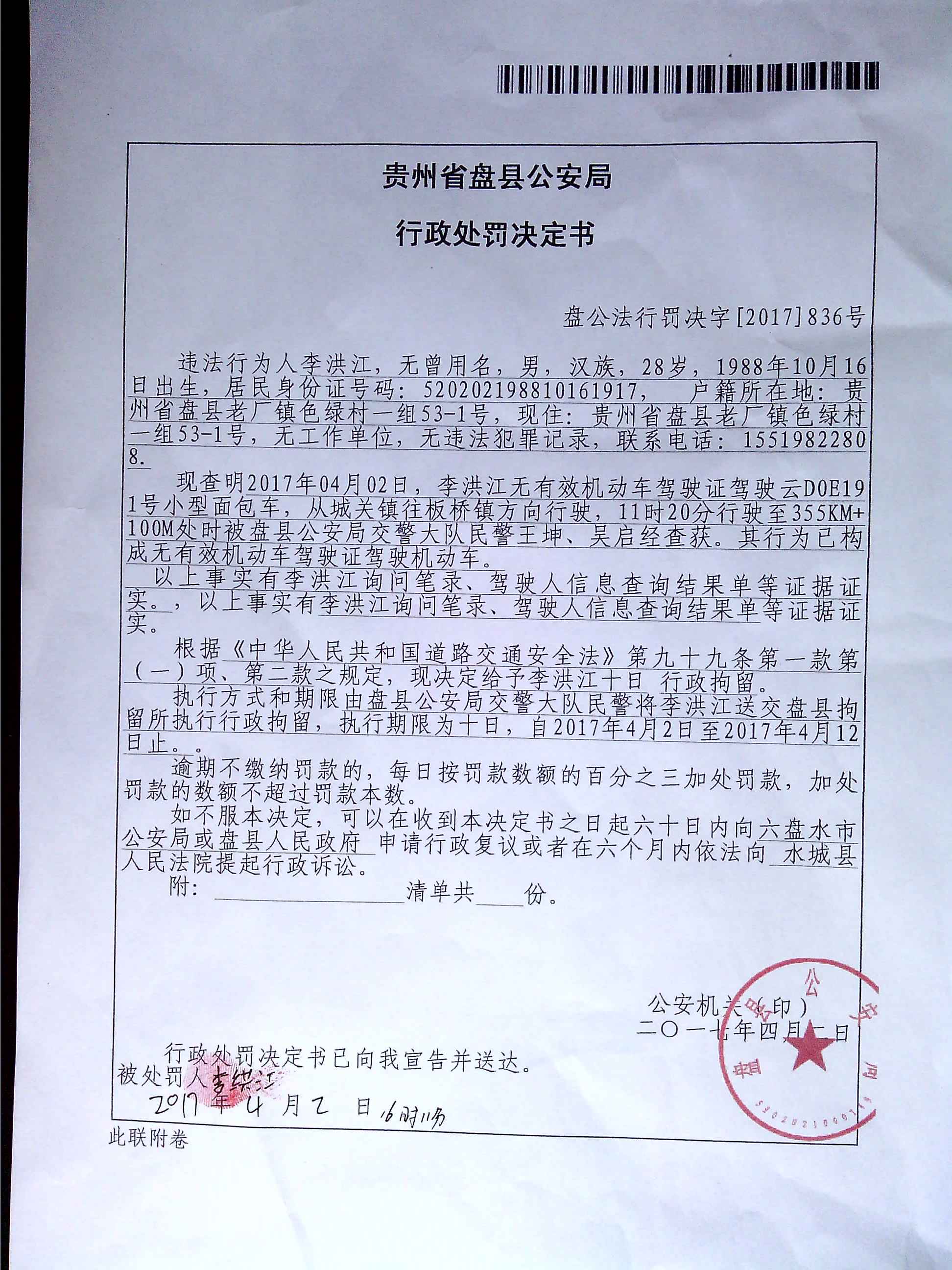 盘州市公安局关于李洪江无证驾驶的行政处罚