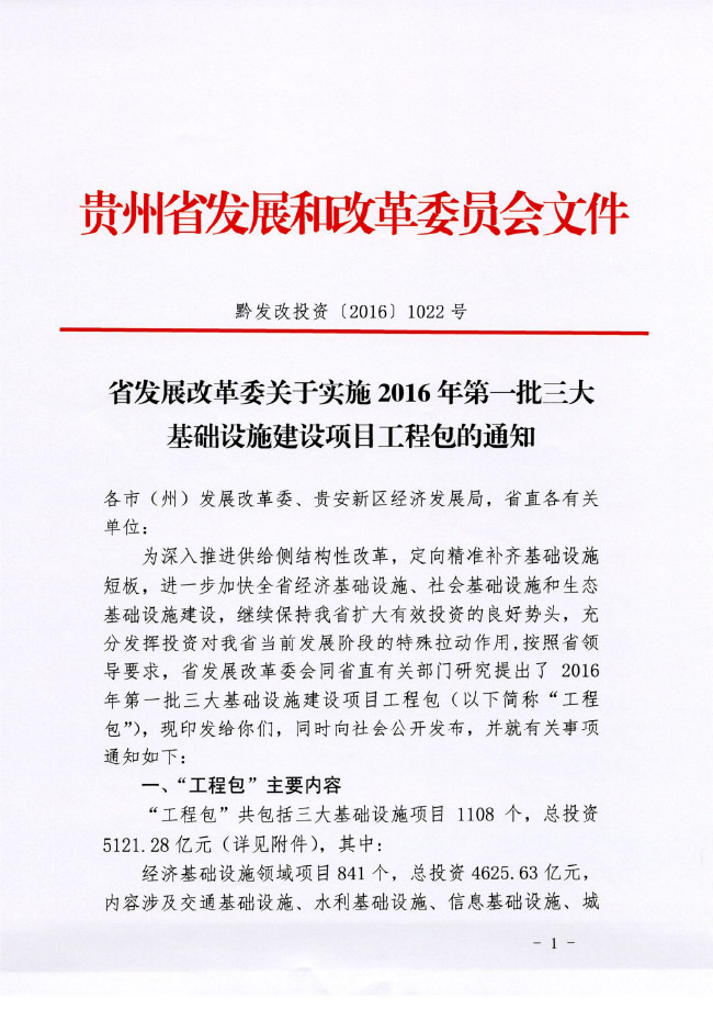 贵州省发展改革委关于实施2016年第一批三大基础设施建设项目工程包的通知
