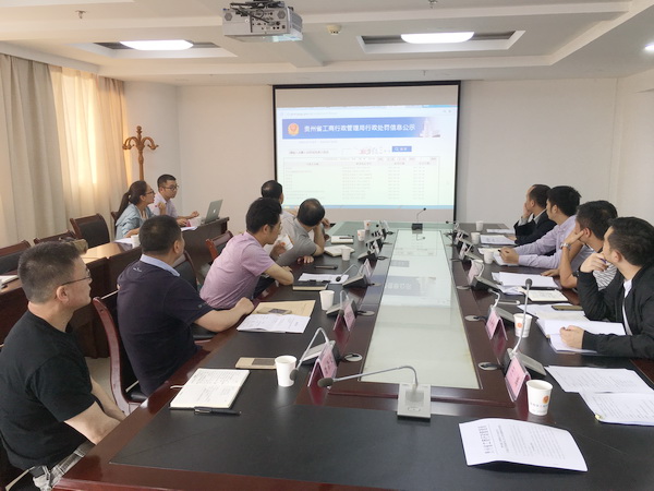 随后,评估组一行来到贵州省工商局,贵州省工商局介绍了全省涉企信用信息归集情况和本部门行政许可和行政处罚信用信息“双公示”工作情况,并演示了工商业务系统、门户网站双公示信息公示情况等。省工商局诚信处、注册指导处、个体处、外资处、微企处、注册分局、信息中心负责人以及拓朴公司代表参加评估会。贵州省工商局通过数据接口同步的方式与贵州省信用信息平台的双公示系统进行数据交换,将本部门行政许可及行政处罚信息及时同步至贵州省双公示系统。2017年1-5月,贵州省工商局共产生行政许可信息2283232条,行政处罚信息1548条,并全部向社会公示,其中所有行政许可及行政处罚事项均记于企业名下并设专栏向社会依法公示,可通过国家企业信用信息公示系统输入企业名称或统一社会信用代码或注册号等方式对企业信息进行查询,同时行政处罚信息通过红盾官网和国家企业信用信息公示系统的通知公告设专栏向社会集中公示。