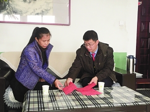 图为徐振洲与大石桥官屯中学老师核对捐款账单
