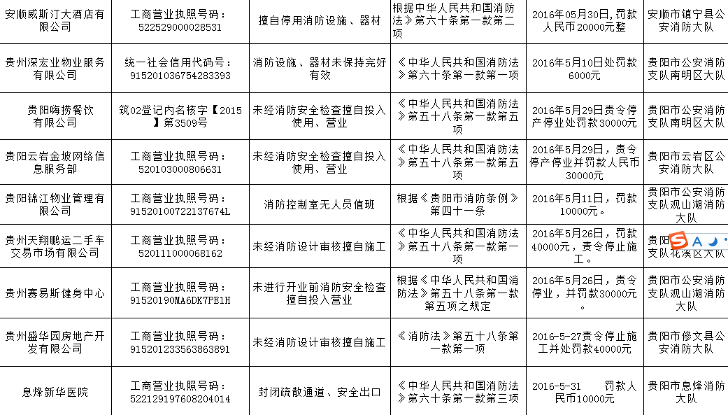 存在消防安全不良行为的16家单位分别为:安顺威斯汀大酒店有限公司;贵州深宏业物业服务有限公司;贵阳嗨捞餐饮有限公司;贵阳云岩金坡网络信息服务部;贵阳锦江物业管理有限公司;贵州天翔鹏运二手车交易市场有限公司;贵州赛易斯健身中心;贵州盛华园房地产开发有限公司;息烽新华医院;六盘水戴氏口腔医院有限公司;成都市绿都物业管理有限公司六盘水分公司;贵州金竹源房地产开发有限公司;锦屏县正大百货商场;余庆县海纳投资有限责任公司;福泉市盛源商业管理有限公司;贵州省罗甸县江海房地产开发有限责任公司。