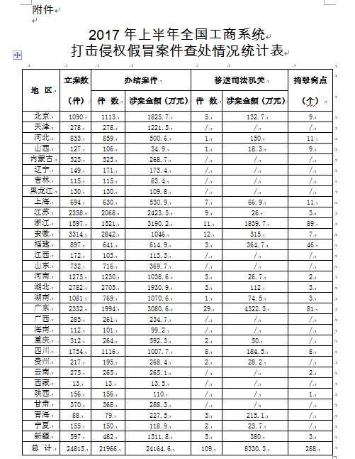 工商总局办公厅关于2017年上半年 全国工商、市场监管部门打击侵权假冒工作情况的通报 办字〔2017〕163号