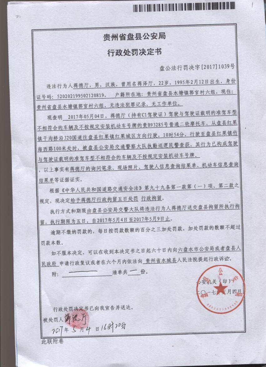 盘州市公安局关于蒋德厅违反《中华人民共和国道路交通安全法》第九十九条第一款第(一)项、第二款的行政处罚