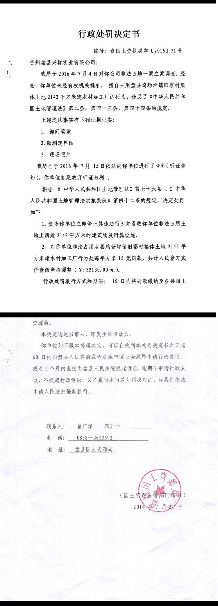盘州市国土资源局关于贵州盘县兴祥实业有限公司非法占地的行政处罚