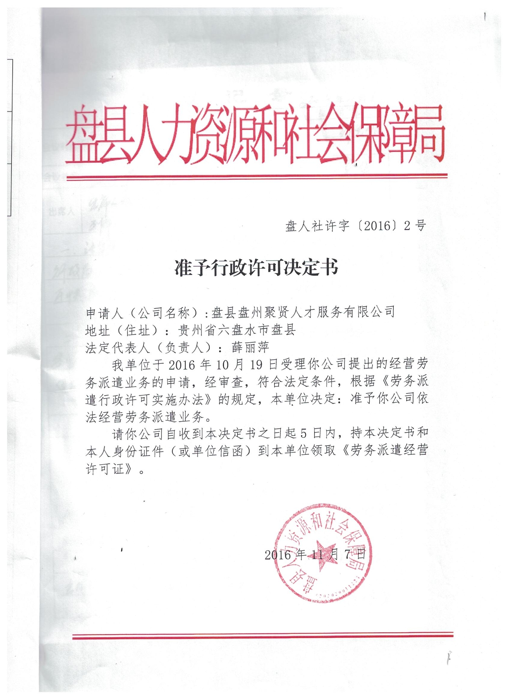 盘州市人力资源和社会保障局关于盘县盘州聚贤人才服务有限公司经营劳务派遣业务的行政许可