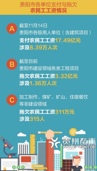 据了解,截至11月14日,贵阳市各级部门已经督促用人单位(含建筑项目)支付农民工工资17.49亿元,涉及8.39万人次。其中,建筑领域清欠农民工工资17.09亿元,涉及8.01万人次;加工制造、煤矿、矿山、住宿餐饮等非建筑领域清欠农民工工资0.4亿元,涉及0.38万人次。